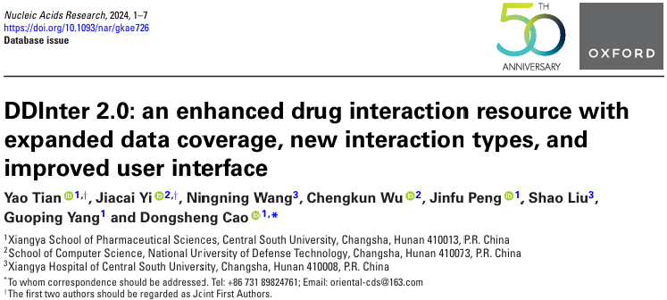 近日,中南大学3044am永利集团官网曹东升教授团队在国际权威期刊《Nucleic Acids Research》(IF=16.6)发表了题为“DDInter 2.0: an enhanced drug interaction resource with expanded data…