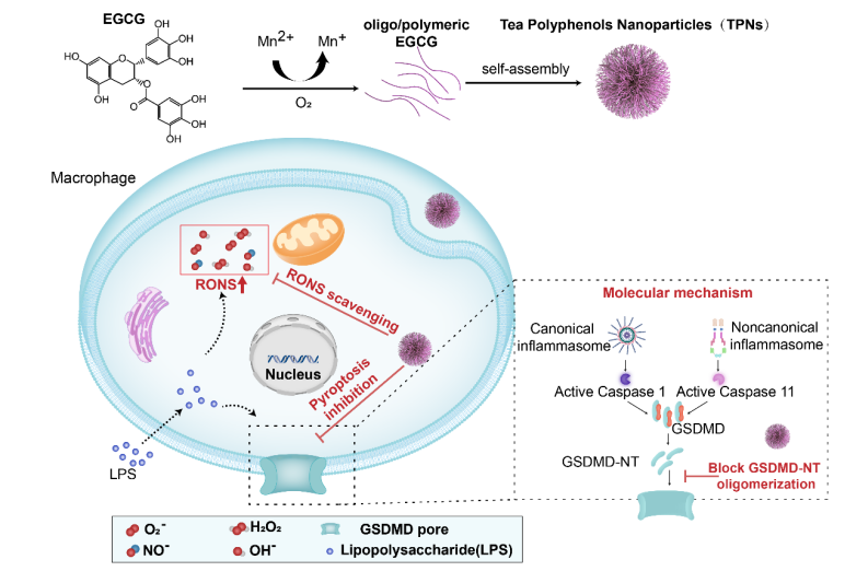 近日,中南大学3044am永利集团官网周文虎教授与湘雅三医院吕奔-赵锴教授团队合作,在纳米材料学领域权威期刊《ACS Nano》(IF=15.881, NI指数期刊)上发表了题为“Intrinsic Radical Species Scavenging Activities of Tea Polyphenols Nanoparticles Blocks Pyroptosis in Endotoxin-Induced Sepsis”的最新原创性研究成果。该研究利用金属离子催化下的表没食子儿茶素没食子酸酯(Epigallocatechin gallate, EGCG)氧化自聚,构建一种新型多功能纳米材料。该纳米材料可通过清除活性氮氧自由基和抗细胞焦亡两条途径,实现对脓毒症的治疗。