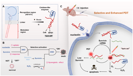 目前,光动力疗法(PDT)因其表面组织渗透、精准的时空控制和相对非侵入性等特点,已在皮肤相关的癌症治疗中展现出显著的应用潜力和天然的优势。但肿瘤缺氧、获得性耐药以及对周围正常组织的光毒性等因素严重影响了PDT的疗效、安全性以及患者依从性。现有的治疗策略主要集中于提高PDT的疗效,而忽略了光敏剂对正常周围组织的潜在毒副作用。研究团队受检测性DNA探针设计策略的启发,构建了一种具有AND逻辑门控的可选择性激活的DNA探针。该DNA探针不仅能够特异性在肿瘤细胞中积累并被活化,从而实现靶向PDT,降低对周围正常组织的光毒性;且其可通过下调肿瘤细胞中Survivin基因的表达以及催化胞内高表达的H2O2产生O2,逆转肿瘤耐药及缺氧等限制,协同增强PDT。