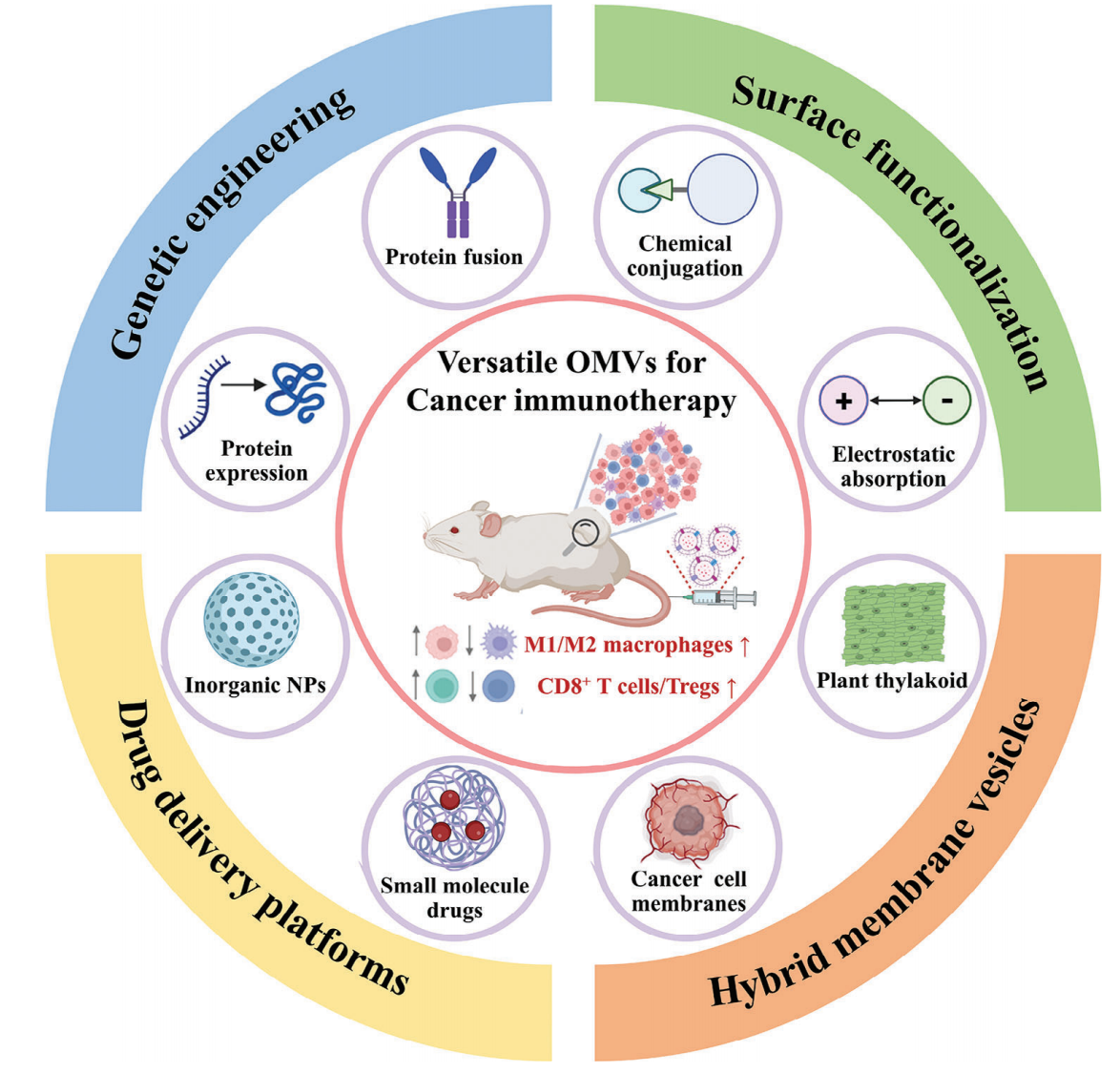 近年来,免疫治疗已成为继手术、化疗和放疗之后抗肿瘤治疗的第四种途径。癌症免疫治疗也正在经历向个性化、精准化和可视化的变革。在诸多相关研究中,细菌性外囊泡(OMV)表现出独特的优势,主要包括天然的免疫原性、实体瘤的靶向性以及可工程化修饰的性能,有潜力成为下一代癌症免疫治疗的前沿治疗手段。基于工程化OMV的诸多优势,该文系统总结了多功能OMV构建中采用的最新技术和方法,深入探讨了改造OMV的创新手段,强调了合理设计策略的重要性和研究价值。总的来说,该文为OMV在联合治疗平台的构建提供了最新的依据与思路。