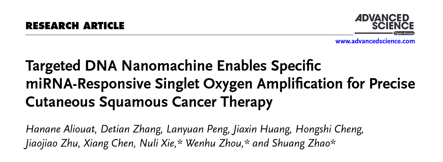 近期,中南大学3044am永利集团官网周文虎教授-谢努力副教授团队联合湘雅医院赵爽副研究员在国际权威期刊《Advanced Science》(中科院一区TOP期刊,影响因子14.3)以Research Article形式发表题为“Targeted DNA Nanomachine Enables Specific miRNA-Responsive Singlet Oxygen Amplification for Precise Cutaneous Squamous Cancer Therapy(特异性miRNA响应的单线态氧放大的DNA纳米机器用于皮肤鳞状细胞癌的治疗)”的原创性论文。