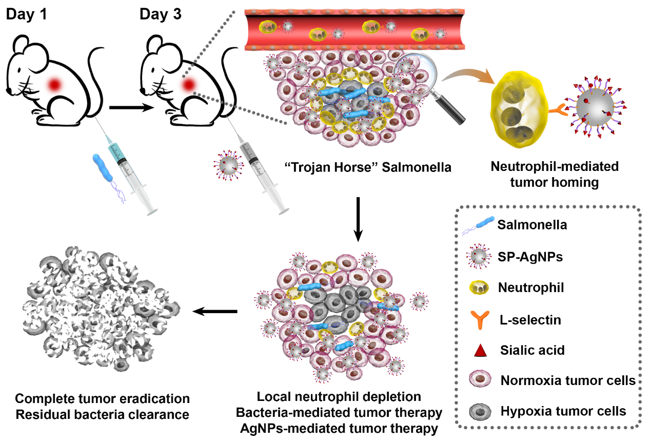 沙门氏菌可选择性地定植于肿瘤低氧区,并通过多种机制发挥抗肿瘤效应,在动物水平展现出显著的抗肿瘤效果,但在临床试验中患者并未受益。机制研究表明,沙门氏菌招募的中性粒细胞是限制其疗效的关键因素。此外,使用沙门氏菌可能引起患者的严重感染,存在一定的安全性风险。为此,本研究开发了一种基于沙门氏菌和纳米银的联合抗肿瘤策略,通过唾液酸修饰的纳米银(SP-AgNPs)靶向中性粒细胞,利用沙门氏菌对中性粒细胞的招募作用,实现纳米银的肿瘤靶向递送;到达肿瘤部位的纳米银可通过直接杀伤肿瘤细胞、清除中性粒细胞提高沙门氏菌的疗效,并通过清除沙门氏菌提升细菌治疗的生物安全性,从而实现高效安全的肿瘤治疗。研究结果可为肿瘤的联合治疗提供新思路,为沙门氏菌的规模化临床使用提供实践依据。