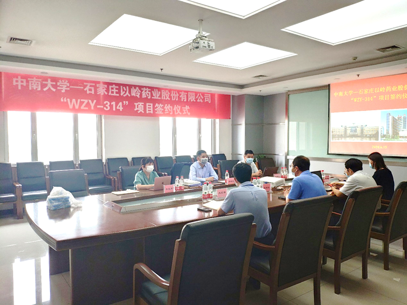 2020年6月15日,重大疾病小分子药物研究团队的胡高云教授、李乾斌教授和彭张哲副教授赴石家庄以岭药业进行签约,双方共同签署了WZY-314项目有关的转让合同,对前期研究材料进行了交接并就后续研究计划进行磋商。按照约定,以岭药业将在法定期限内就该成果申请国际PCT专利,并承担所有中国市场及国际市场后续开发工作,以岭药业将以里程碑现金加上市后提成的方式支付中南大学相关的转让费用。