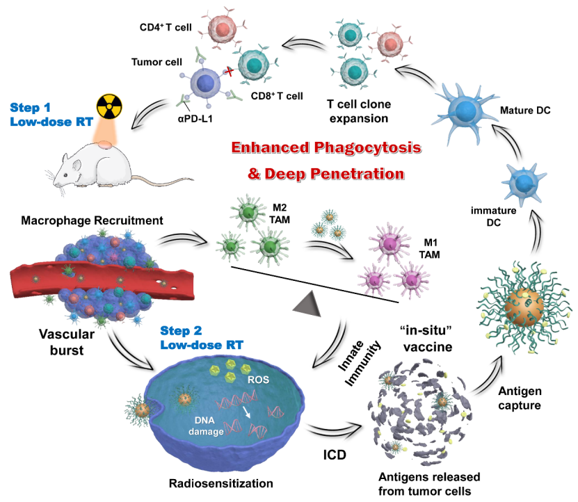 放疗是临床治疗肿瘤的主要方式,其疗效与放疗剂量密切相关,然而高剂量放疗会不可避免的产生严重的副作用。放疗增敏可选择性增强肿瘤细胞对辐射的敏感性,在较低的放疗剂量下即可实现良好的疗效。为此,该研究以常用的放疗增敏剂纳米金为内核,吸附免疫佐剂CpG,构建球形核酸;通过放疗招募巨噬细胞,诱导血管爆破,促进球形核酸在肿瘤部位的蓄积;继而将肿瘤部位的巨噬细胞由M2型极化为M1型,增强其吞噬能力,促进球形核酸在肿瘤部位的深层渗透;再次实施放疗,在球形核酸的放疗增敏效应下,肿瘤细胞发生免疫原性死亡,释放的抗原又被球形核酸捕获,形成原位肿瘤疫苗,诱导强烈的抗肿瘤免疫反应,并显示出与PD-L1抗体的协同作用;实现肿瘤的放射免疫协同治疗。该研究为肿瘤治疗提供了一种新策略,同时也为肿瘤药物递送面临的靶向蓄积和渗透性差的难题提供了新的解决方案。