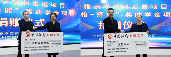 仪式上,泰格医药总裁曹晓春和公益基金会理事长刘陆洋分别向中南大学教育基金会递交捐赠支票,教育基金会随后向泰格医药和泰格医药公益基金会颁发了捐赠证书,以感谢企业对中南大学教育事业的支持。