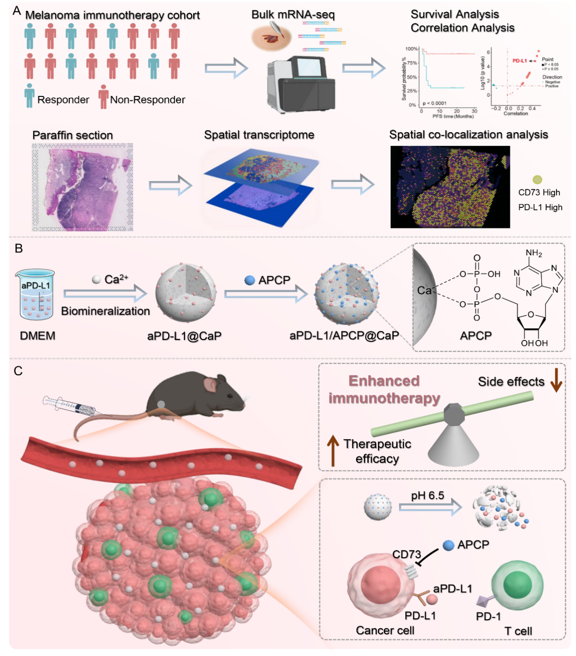 黑色素瘤是一种恶性皮肤肿瘤,特别是在无法切除和转移性病例中,治疗面临巨大挑战。尽管针对PD-1/PD-L1的免疫检查点抑制剂为治疗带来了新的希望,但其疗效存在低反应率的问题。“免疫双靶”抑制的策略提高了疗效,但其在临床的应用受到irAEs的限制。通过多组学数据分析,我们发现黑色素瘤中CD73和PD-L1共表达与免疫治疗预后相关,提示双靶点抑制可能具有良好的协同作用。基于这一发现,我们开发了一种新的治疗策略(aPD-L1/APCP@CaP),利用磷酸钙纳米粒(CaP)共同递送aPD-L1和APCP。通过生物矿化方法构建的CaP具有高载药量和pH响应药物释放特性,有效避免了aPD-L1导致的irAEs,同时显著增强了抗肿瘤疗效,甚至超过了20倍剂量的游离aPD-L1。此外,CaP共递送aPD-L1和APCP显示出协同抗肿瘤效应,显著激活免疫反应并通过免疫记忆效应防止肿瘤复发。本研究提出的双靶向共递送“增效减毒”策略是提高肿瘤免疫治疗疗效极具应用前景的手段。