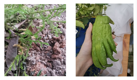 石松看起来毛茸茸的,但是摸起来并不柔软。有弹性的针叶在指腹微微摩擦,带来奇特的触觉。早已在许多香水里听闻过佛手的大名,今日荣幸一睹真容。即使还未成熟,只需轻微的触摸,手上便能留下清新的柑橘香。
