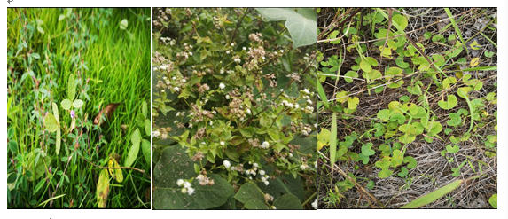 吃过午饭,略作修整,我们便正式开始野外见习,出发之前,李老师提到我们是最轻松的一届,没有期末考试的压力,只需尽心、尽兴地“玩”,学便是玩,我们哄笑,却也不免认同,可不,寓教于乐,学习便不是乏味苦闷的,玩玩学学,轻松欢愉,压力不免有,仍旧是能够开心的,源于丰实、源于志趣。我们是第五组,由厉老师和李老师带领,老师风趣亲切,内容详实丰富,真真收获颇多。第一天的下午,我们没有特定的方向,门口即是起点,当其他小组前往各个棚园时,我们在周边的小丛中开始了寻找,便是那些寻常的植株,那些往日的“野草”,在老师的介绍下一一拥有了姓名,深切记得初行三处的豆科三连——截叶铁扫帚、鸡眼草、野大豆,同一科属却各有千秋,易被忽视的他们其实是各持姿态,拥有着自己的特点,只是需要我们更细心的找寻与查辨。第一天的下午,我们便见到了许多,收获了许多,当其他小组在别处会师时,我们另辟蹊径,走过瓜蒌地,路过饲鸡园,爬上小坡,跨过枝条,步行间,一大袋的标本采集是我们的收获,蓝墨印上白纸是我们的记录