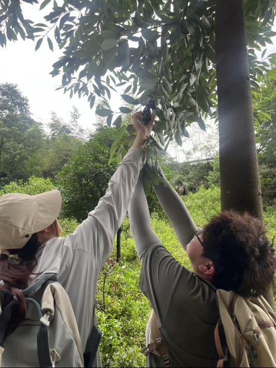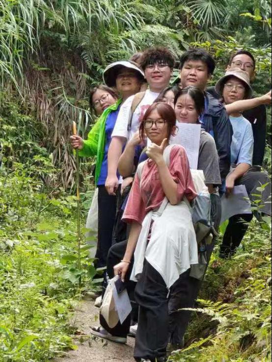 我们的带教老师是曾嵘老师,她是一位经验丰富,同时又善解人意的老师。在她的带领下,我们不仅快速地认全了多种植物,采药的过程中也充满了欢声笑语,不觉疲惫。“揉揉它的叶片,闻闻是什么味道?”“咦,臭臭的”“这个植物就是臭牡丹”老师一问一答式的实践教学方式既饱含乐趣,又能让我切身体会到该如何辨认植物,让我们受益匪浅。结紫花的麦冬、孢子囊发达的海金沙,还有沿途许多日常可见、却感觉熟悉又陌生的药食两用植物,等等,这些都随着绘声绘色的采药实践,深深印刻在我的脑海中。即便这一路上,我们迎着烈日前行,抑或是忽逢暴雨,这些客观的外在天气条件从不浇灭我们的热情,在曾老师的带领下,我们一步步克服困难,走过最崎岖的山路,终能攀登上最高峻的顶峰。
